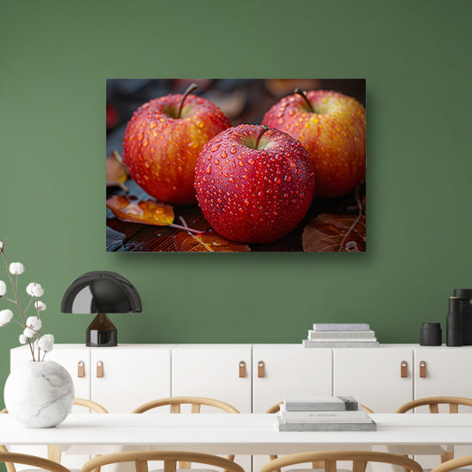 Drie Kleurrijke Appels met Dauwdruppels canvas met baklijst