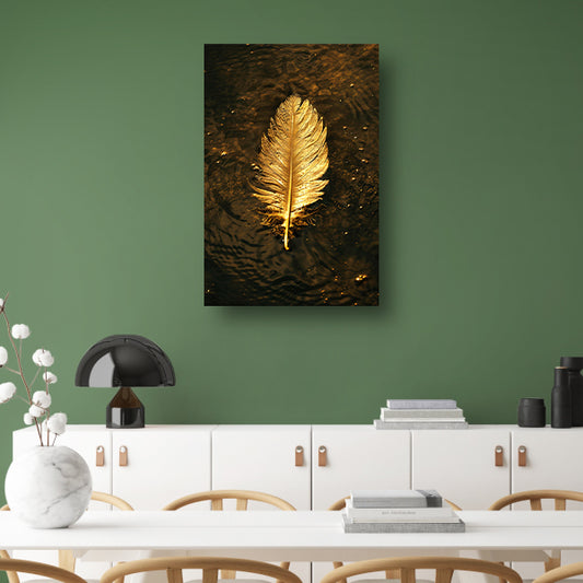 Gouden veer drijvend op mysterieus donker water canvas met baklijst