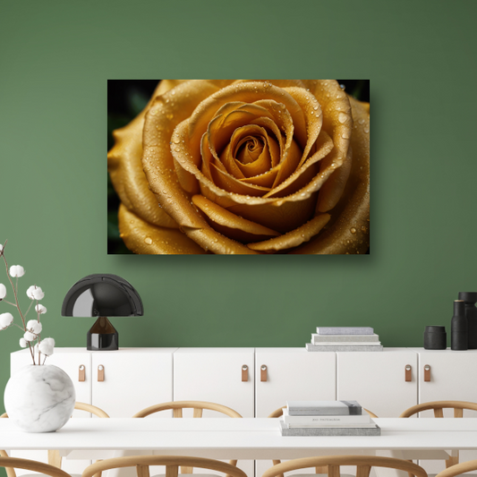 Gouden Roos met Dauw op Zwarte Achtergrond canvas met baklijst