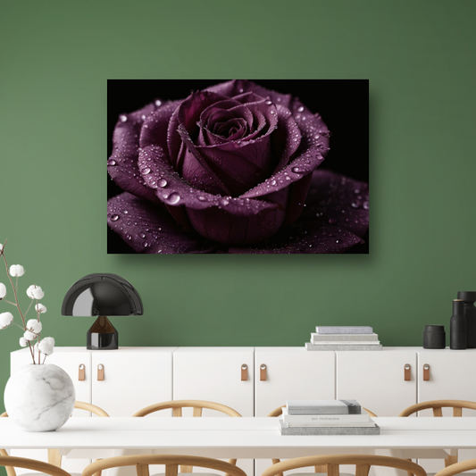 Paarse roos close-up met waterdruppels canvas met baklijst