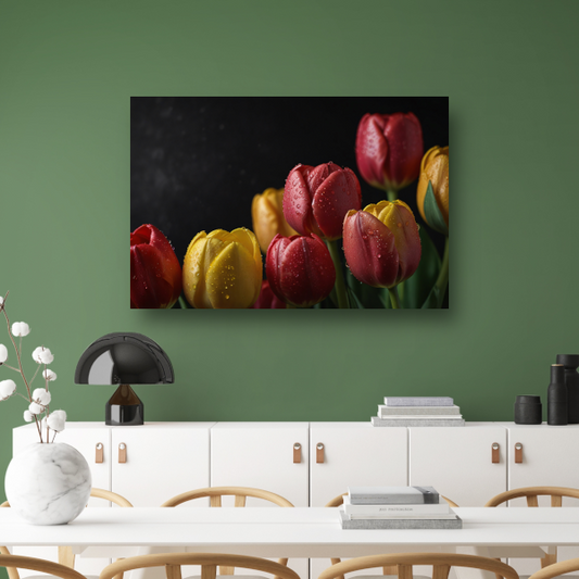 Levendige tulpen met ochtenddauw op zwarte achtergrond canvas met baklijst