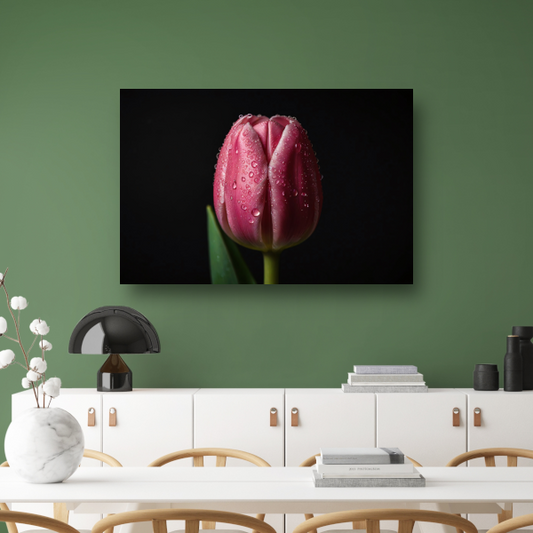Donkergroene Tulp met Dauw op Zwart canvas met baklijst