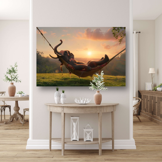 Olifant in een hangmat tijdens zonsondergang canvas met baklijst