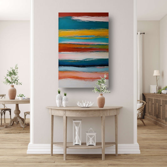 Abstracte horizon in rood, geel en blauw canvas met baklijst