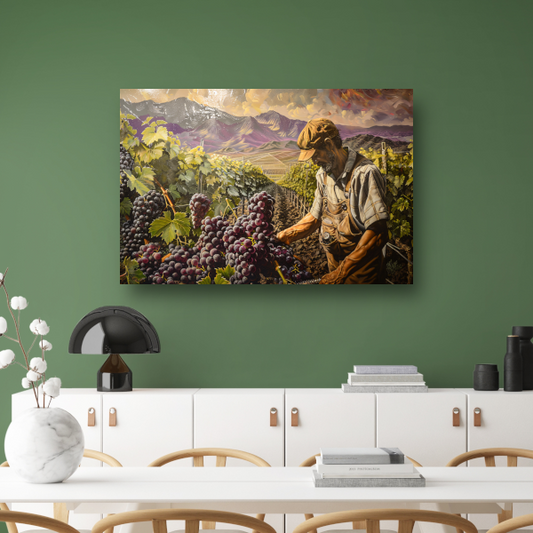 Wijnboer tijdens druivenoogst in vallei canvas met baklijst