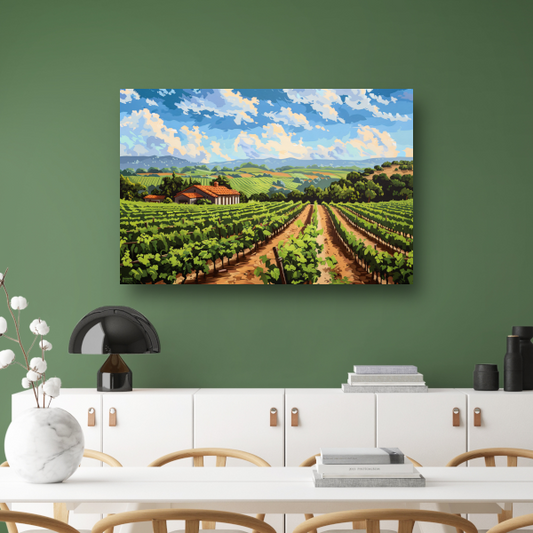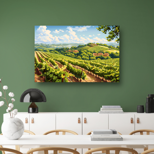 Wijngaard onder een helderblauwe lucht canvas met baklijst