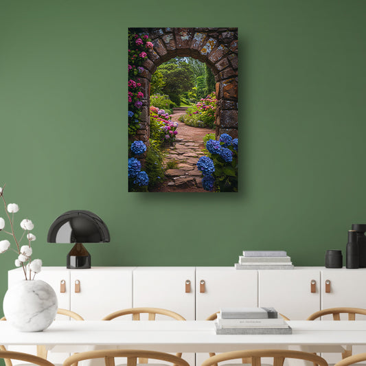 Stenen boog uitzicht op bloeiende tuin canvas met baklijst