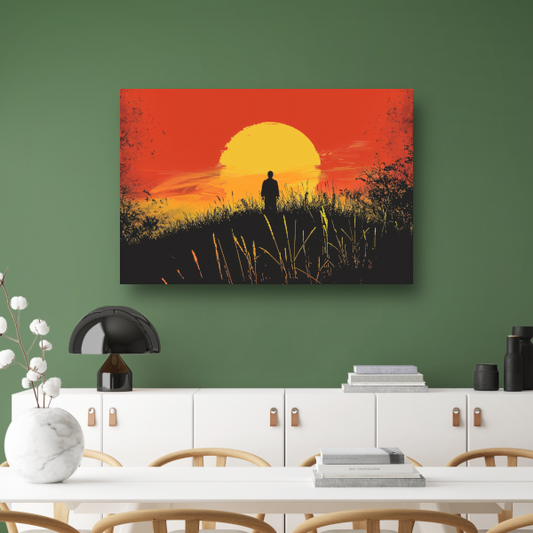 Persoon Contempleert Zonsondergang in Vurig Landschap canvas met baklijst