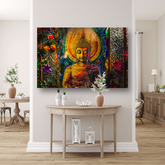 Eclectische Boeddha met Kleurrijke Achtergrond canvas met baklijst