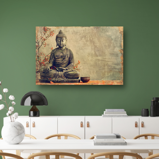 Serene Boeddha met bloesems in sepia tonen canvas met baklijst