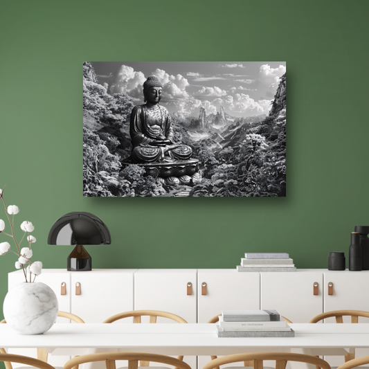 Serene Boeddha in monochroom berglandschap canvas met baklijst