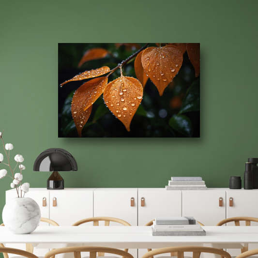 Dauwdruppels op Oranje Zomerbladeren canvas met baklijst