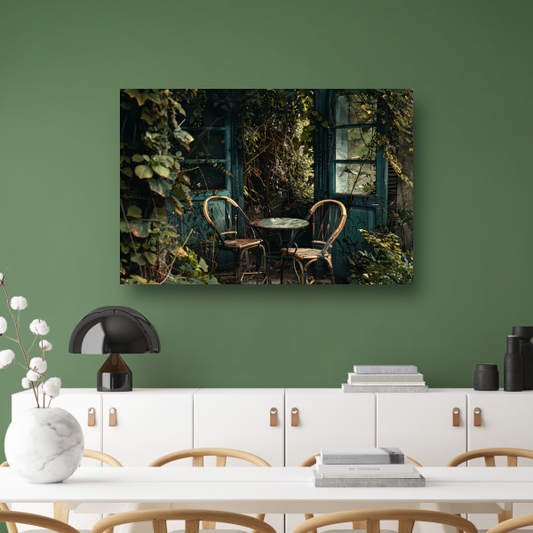 Rustiek Terras met Bistrostoelen bij Schemer canvas met baklijst