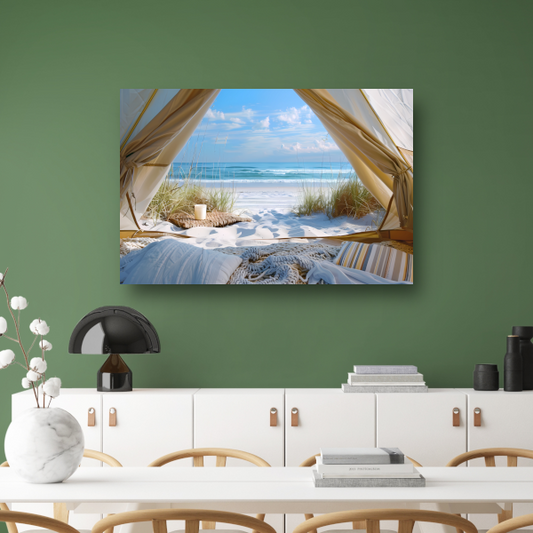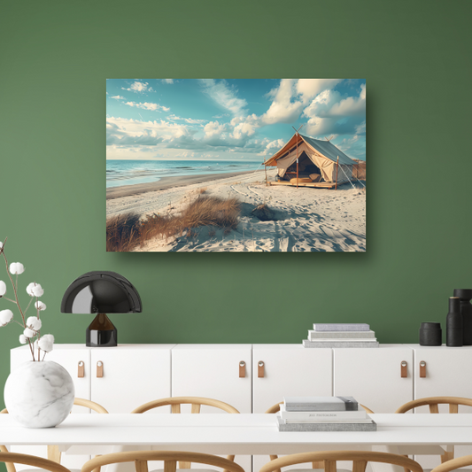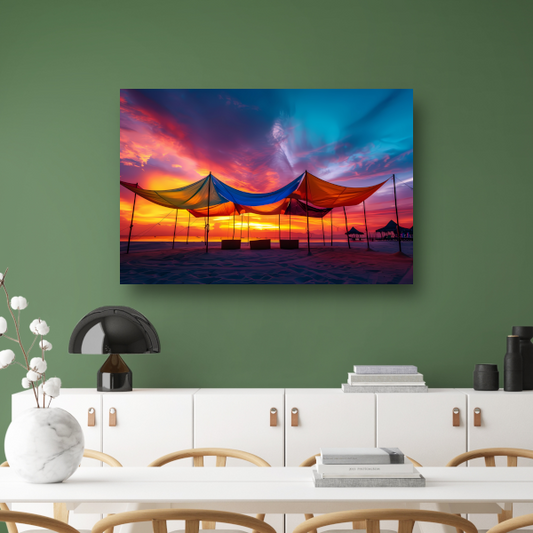 Zomerse tenten op het strand bij zonsondergang canvas met baklijst