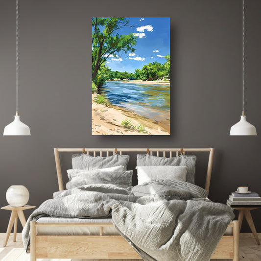 Kleurrijk minimalistisch schilderij van rivier en bergen canvas