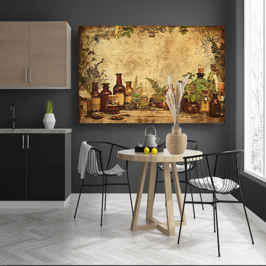 Vintage kruiden en glazen flessen op plank poster
