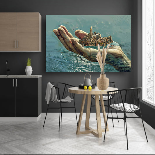 Stad gedragen door een gigantische hand poster