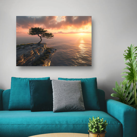 Eenzame boom op klif bij zonsondergang poster