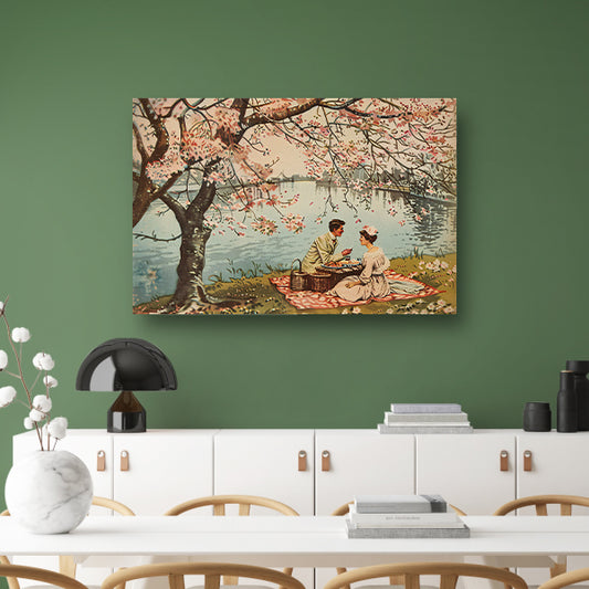 Romantische picknick onder bloeiende kersenbomen poster