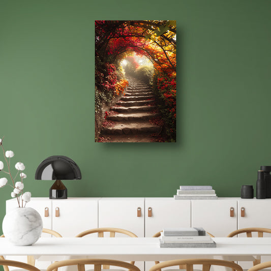 Stenen trap in herfstbos met kleurrijk gebladerte poster