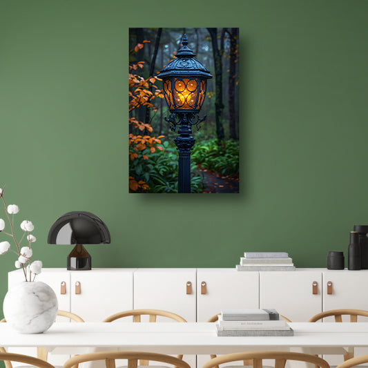 Lantaarnpaal in een mistig bos poster
