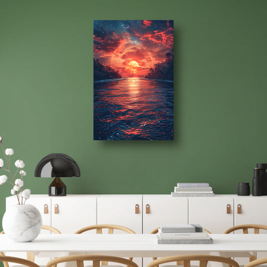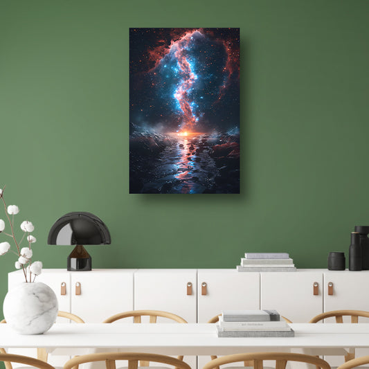 Kosmische rivier bij zonsondergang op buitenaardse planeet poster