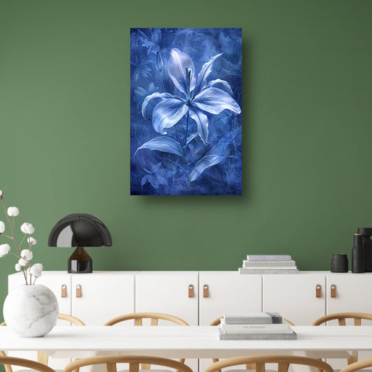 Gedetailleerde digitale lelie in blauw-wit canvas