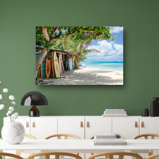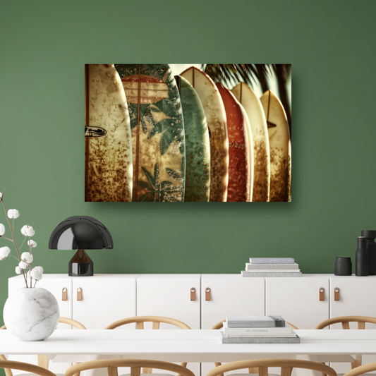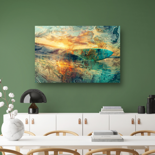 Kleurrijke Surfplank in Glinsterende Zee bij Zonsondergang poster