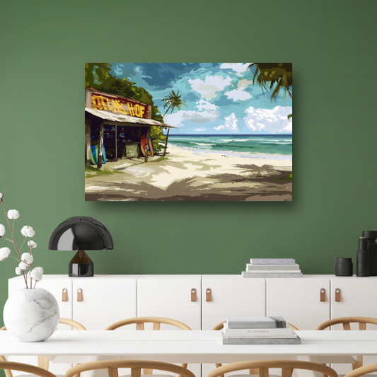 Abstracte Zonsondergang en Surfplank in Zee poster
