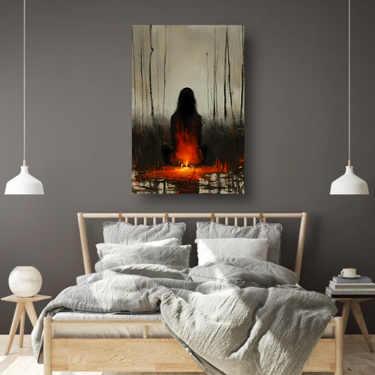 Mysterieus silhouet bij kampvuur in bos canvas