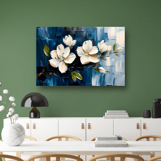 Abstracte witte bloemen op blauwe achtergrond canvas