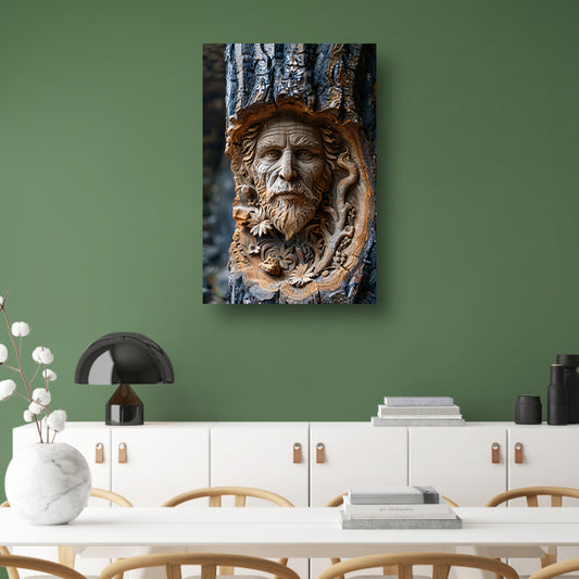 Houtsnijwerk van een gezicht in een boomstam canvas