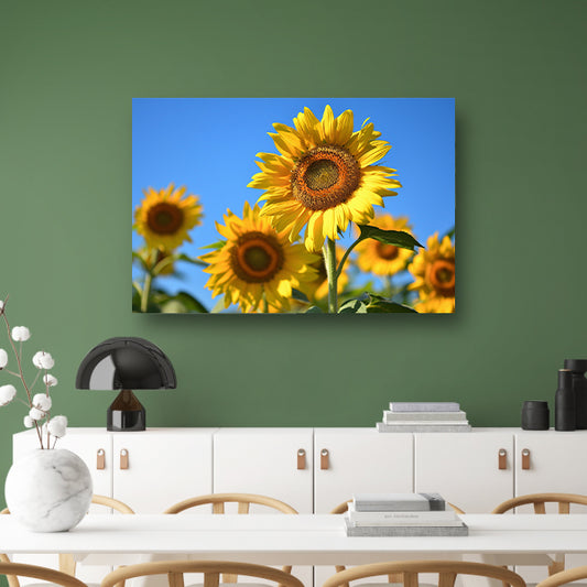 Levendige zonnebloemen tegen een helderblauwe lucht canvas