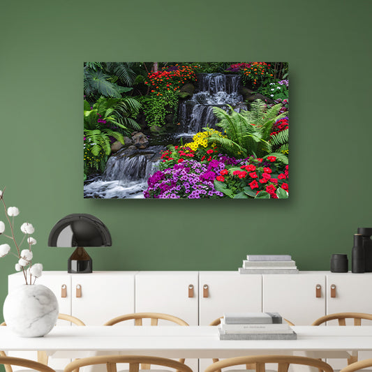 Kleurrijke tuin met waterval en diverse bloemen canvas