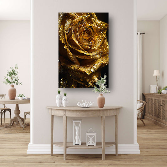 Gouden roos met fonkelende waterdruppels close-up canvas