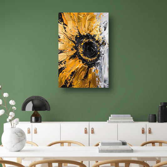 Abstracte zonnebloem in zwart, goud, oranje en wit canvas