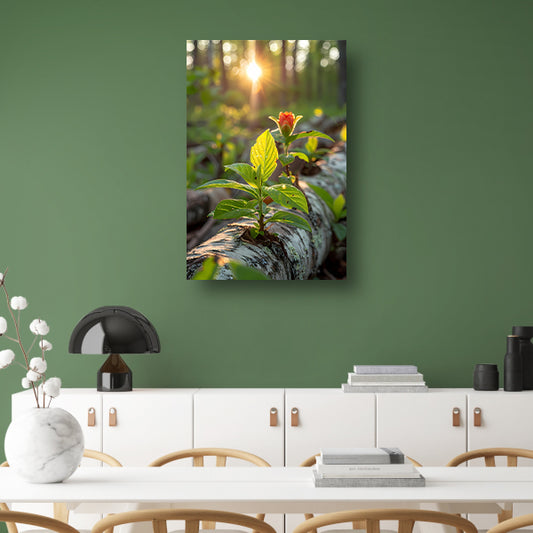 Plant groeit uit boomstam in zonlicht canvas