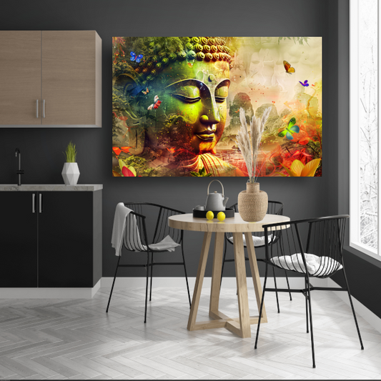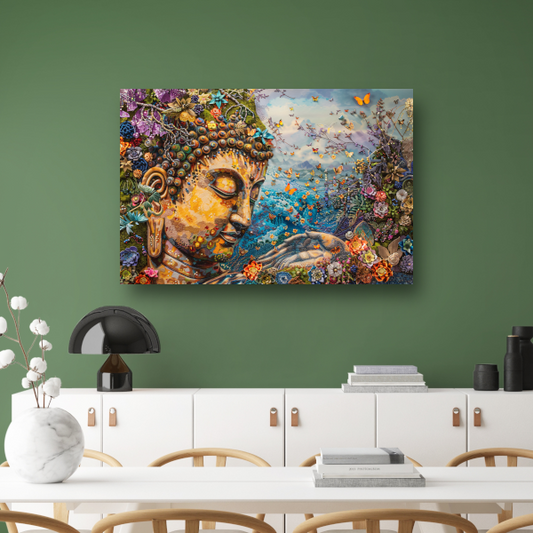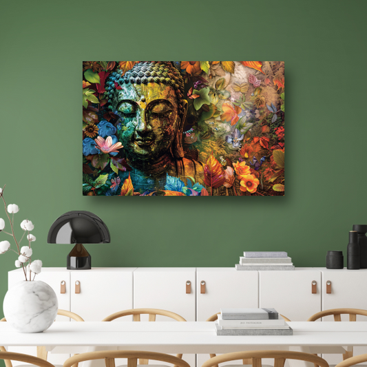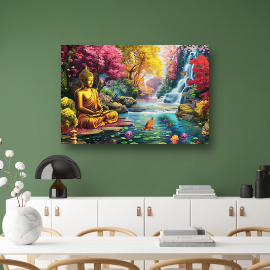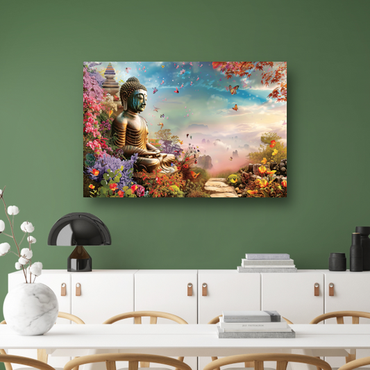 Sereniteit: Boeddha in kleurrijk natuurparadijs poster