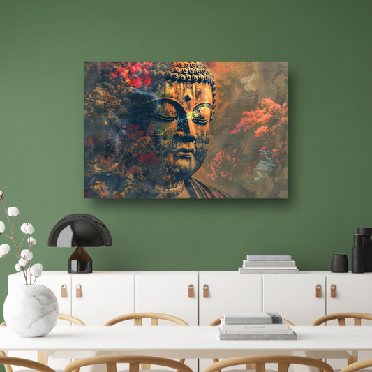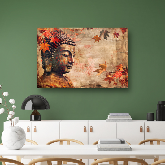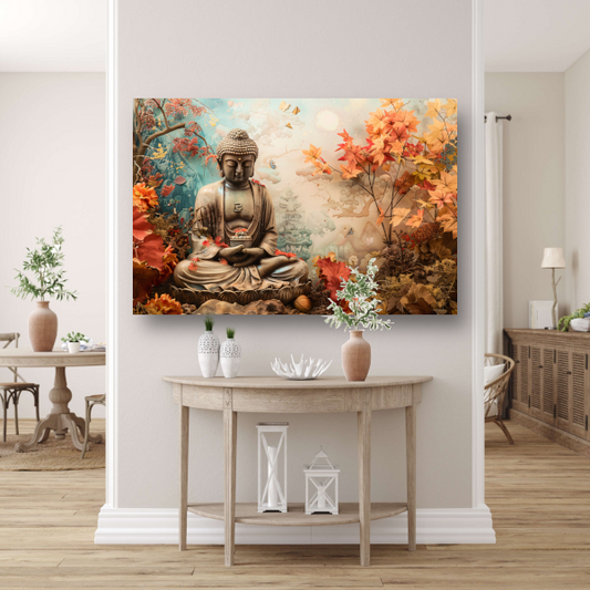 Boeddha in herfstpracht met kleurrijk bladerdek poster