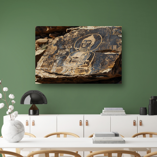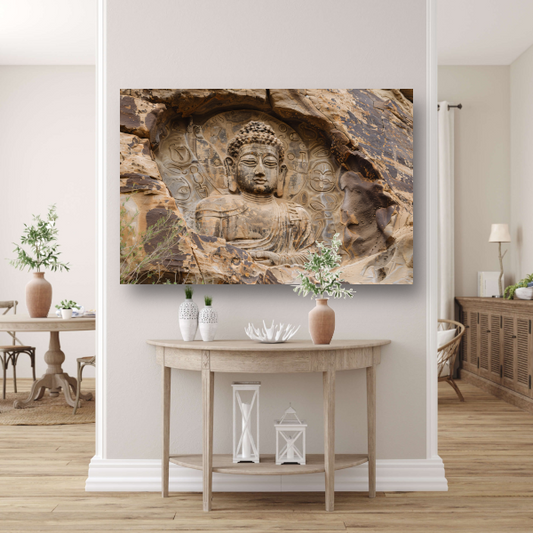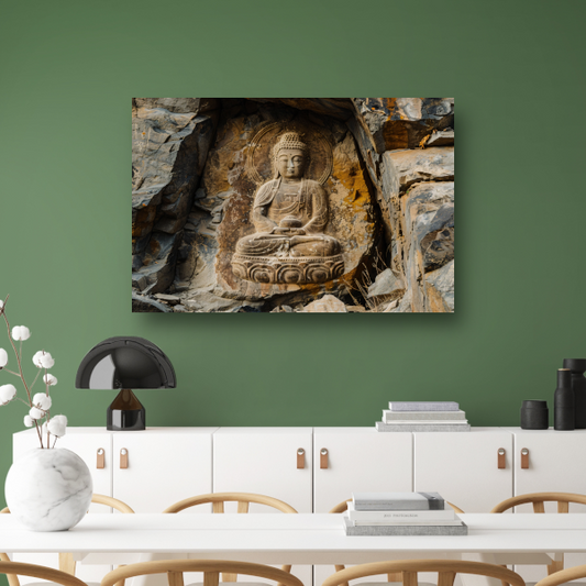 Meditatief Boeddha Sculptuur in Rotswand poster