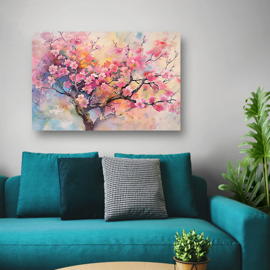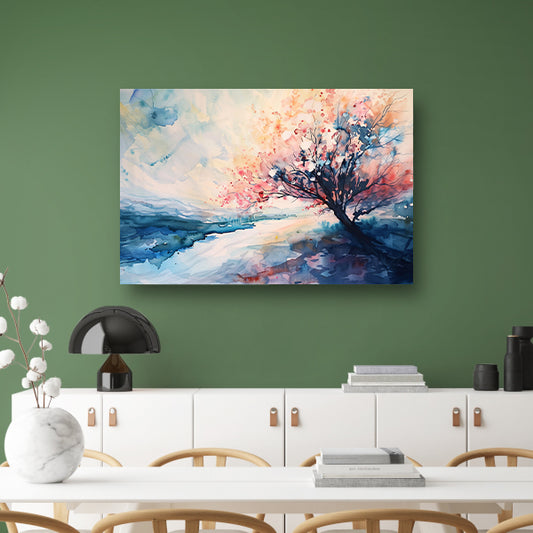 Bloeiende boom in serene aquarel landschapsweergave canvas