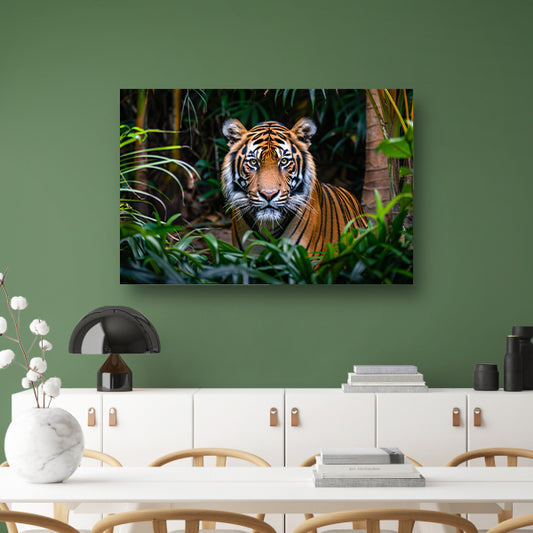 Tijger in dichte jungle, intense blikposter