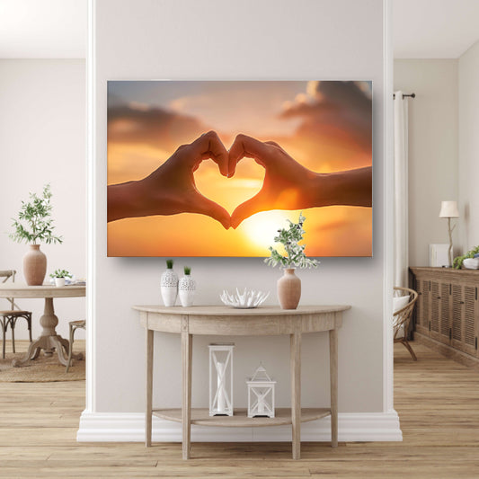 Handen vormen hart bij zonsondergang canvas
