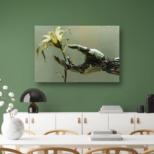 Robotische hand houdt delicate bloem vast canvas
