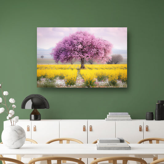 Bloeiende boom in kleurrijk bloemenveldposter