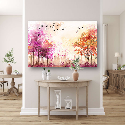 Kleurrijke skyline met herfstbomen en vogelsposter