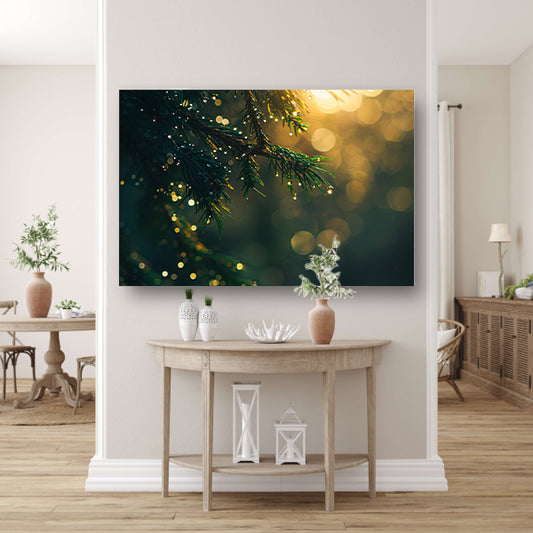 Dauw op dennentak in ochtendzon poster