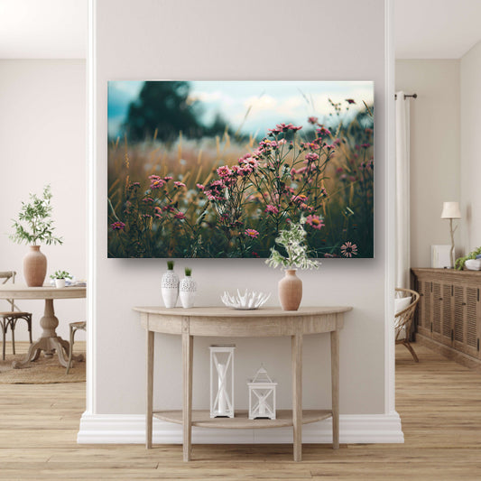 Bloemenveld bij zonsondergang in de natuurposter