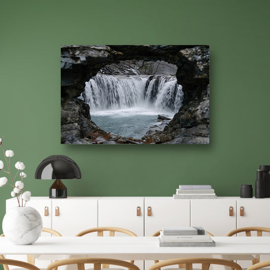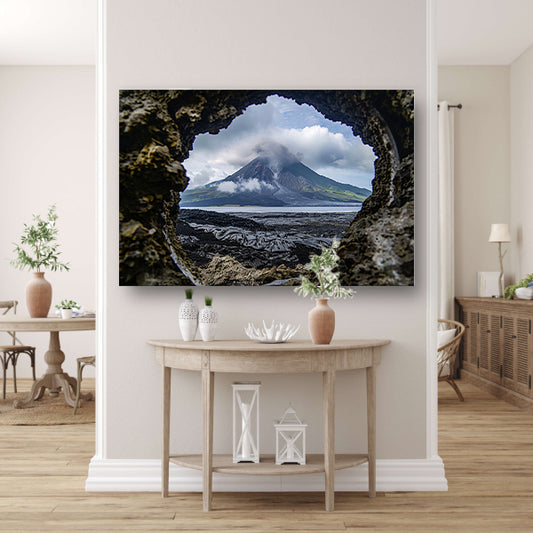 Prachtig uitzicht op vulkaan door rotsopening poster