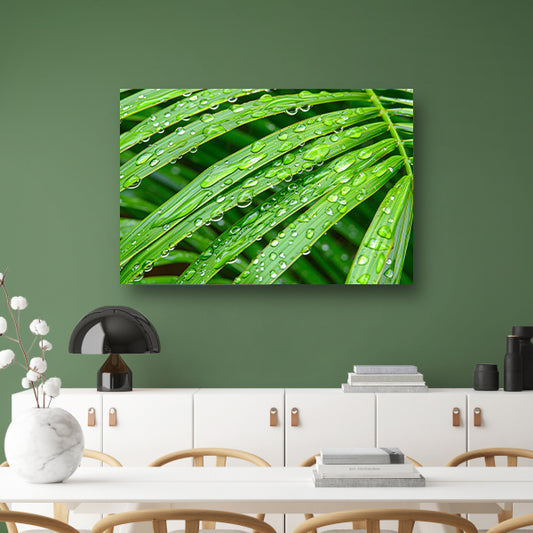 Groene bladeren met dauwdruppels in detail canvas